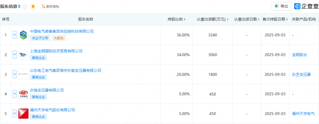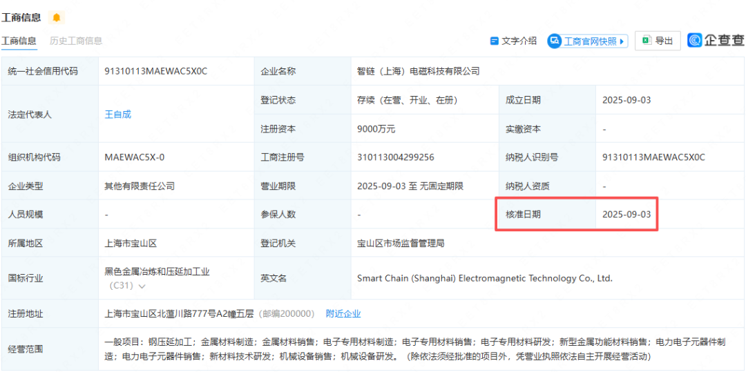 2025年9月3日,智链(上海)电磁科技有限公司成立配资专业炒股配资网站,注册资本9000万元,经营范围包含:电子专用材料制造;电子专用材料销售;电子专用材料研发;新型金属功能材料销售等。企查查股权穿透显示,该公司由宝钢股份全资子公司上海宝钢国际经济贸易有限公司、许继电气旗下许继变压器有限公司、中国电气装备集团供应链科技有限公司等共同持股。